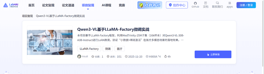 大模型实验室Lab4AI是高性能算力驱动的AI实践内容生态社区,有充足的弹性H卡,致力于为高校科研人员、AI开发者和学习者提供高性能算力支持与开发平台,通过构建开放协同的内容生态体系,深度整合”算力资源+实验平台+社区互动”三大模块,重点面向高算力密集型应用场景,助力大模型训练、微调与推理,系统化推动大模型技术从科研创新到实际应用的转化效率。