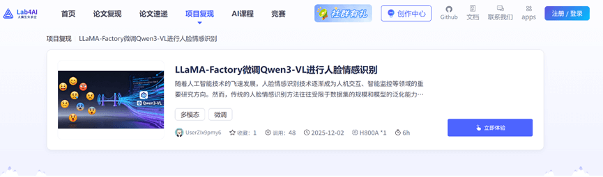 点击“立即复现”,环境、代码、数据集和算力,一应俱全,一键体验热门论文与项目的复现